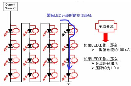 區(qū)域照明應(yīng)用中通常會(huì)采用多串LED,雖然LED本身可靠性高,但若LED串中的某個(gè)LED開(kāi)路,那么整串LED就可能關(guān)閉,而街道照明等應(yīng)用中必須避免這種狀況,從而降低后期維護(hù)成本。為了增強(qiáng)LED串的可靠性,這種安森美半導(dǎo)體推出了NUD4700 LED電流旁路保護(hù)器。NUD4700器件是一款分流器件,當(dāng)LED串中某個(gè)LED開(kāi)路時(shí),就會(huì)提供電流旁路,確保整串LED不會(huì)關(guān)閉;而且恰當(dāng)處理散熱的話,還可支持大于1 A的大電流,其工作原理如圖8所示。