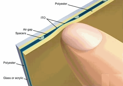 相反地,這種技術(shù)的主要缺點源于觸控屏幕的多層結(jié)構(gòu)。其基層一般是玻璃,表面涂有一層均勻的ITO,頂層通常由聚乙烯對苯二甲酸酯(PET)制造,內(nèi)表面(Inner Surface)也涂有一層均勻的ITO,而外表面(Outer Surface)則有硬涂層,以為保護作用,而形成空氣隙以把這些導(dǎo)電層隔離開的細小透明間隔點常在打印制程中產(chǎn)生。這種多層材料堆棧的多層結(jié)構(gòu)對透光性有所影響,一般將降至約透明玻璃透光率的75%,同時,空氣間隙可能產(chǎn)生薄霧效應(yīng),進一步降低清晰度。此外,這種結(jié)構(gòu)很容易刮傷損壞,而且因為機械軸性不重合,還須仔細校準以確定X、Y坐標(biāo)范圍,其它弱點還包括可能吸收電氣噪聲,尤其是來自液晶顯示器(LCD),這時一般須進行濾波,將導(dǎo)致反應(yīng)時間的延長,當(dāng)然,控制器一次只能處理一個觸摸位置,也是一大局限。