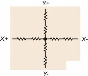 在最簡單的四線(Four-wire)電阻式連接中,頂層兩端和低層兩端分別各連接兩個電極,兩層的電極互相呈九十度交叉,形成四線星狀連接結(jié)構(gòu),這實際上就是一對彼此正交的電位計(圖2),相當(dāng)于機械操縱桿的平面屏幕模擬。為了在X軸方向測量觸摸位置,觸控板的控制器將X-設(shè)為接地,而X+偏置為參考電壓,然后從Y層的兩端讀取電壓,以找出X軸上兩層的接觸點。同樣地,控制器透過在Y層的電極上加載驅(qū)動電壓,并從X層讀取觸摸點電壓,可以確定Y軸上的觸摸位置。
