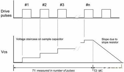 脈沖串產(chǎn)生的第一個斜坡是加到采樣電容上的梯級波形訊號,脈沖串過后,驅(qū)動器把斜率電阻的參考端切換為高電平,對采樣電容進行放電,直到將電荷用完,電壓比較器檢測出零交叉點為止,獲得零交叉點所需的斜坡時間與X、Y電荷耦合成比例,并隨用戶手指觸摸面板表面而減?。▓D5)。