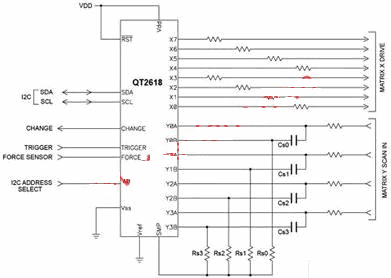透過連接一個放在六電極Y層上的八電極X層,控制器可支持大至8寸的雙觸控屏幕,而且這種多功能控制器能感測多達六個滑塊或四十八個離散式按鍵,或按鍵、滑塊與觸摸區(qū)域的組合,該控制器為接腳數(shù)精簡的版本,利用類似的簡單布線圖(圖8),能夠驅(qū)動八條X軸和接收四條Y軸,或區(qū)分多達三十二個離散式按鍵。