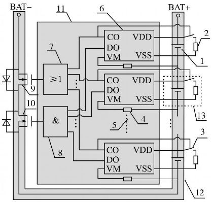采用單節(jié)鋰電池保護(hù)芯片設(shè)計的具備均衡充電能力的鋰電池組保護(hù)板示意圖如圖1所示。其中:1為單節(jié)鋰離子電池;2為充電過電壓分流放電支路電阻;3為分流放電支路控制用開關(guān)器件;4為過流檢測保護(hù)電阻;5為省略的鋰電池保護(hù)芯片及電路連接部分;6為單節(jié)鋰電池保護(hù)芯片(一般包括充電控制引腳CO,放電控制引腳DO,放電過電流及短路檢測引腳VM,電池正端VDD,電池負(fù)端VSS等);7為充電過電壓保護(hù)信號經(jīng)光耦隔離后形成并聯(lián)關(guān)系驅(qū)動主電路中充電控制用MOS管柵極;8為放電欠電壓、過流、短路保護(hù)信號經(jīng)光耦隔離后形成串聯(lián)關(guān)系驅(qū)動主電路中放電控制用MOS管柵極;9為充電控制開關(guān)器件;10為放電控制開關(guān)器件;11為控制電路;12為主電路;13為分流放電支路。單節(jié)鋰電池保護(hù)芯片數(shù)目依據(jù)鋰電池組電池數(shù)目確定,串聯(lián)使用,分別對所對應(yīng)單節(jié)鋰電池的充放電、過流、短路狀態(tài)進(jìn)行保護(hù)。該系統(tǒng)在充電保護(hù)的同時,通過保護(hù)芯片控制分流放電支路開關(guān)器件的通斷實現(xiàn)均衡充電,該方案有別于傳統(tǒng)的在充電器端實現(xiàn)均衡充電的做法,降低了鋰電池組充電器設(shè)計應(yīng)用的成本。