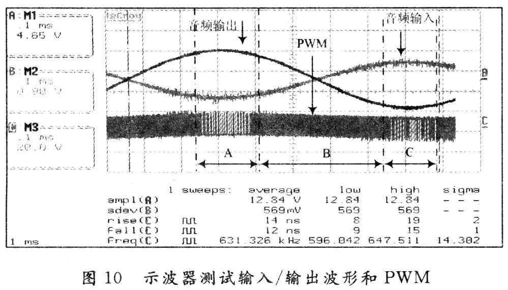圖10測試了TFA9810T功放音頻輸入端為1 kHz的2V。單音頻信號波形,輸出端揚聲器端到GND間為12.84V。,圖9中LPF。濾波前功放輸出的PWM波形。圖11~圖13分別拓展了圖10中A/B/C區(qū)。