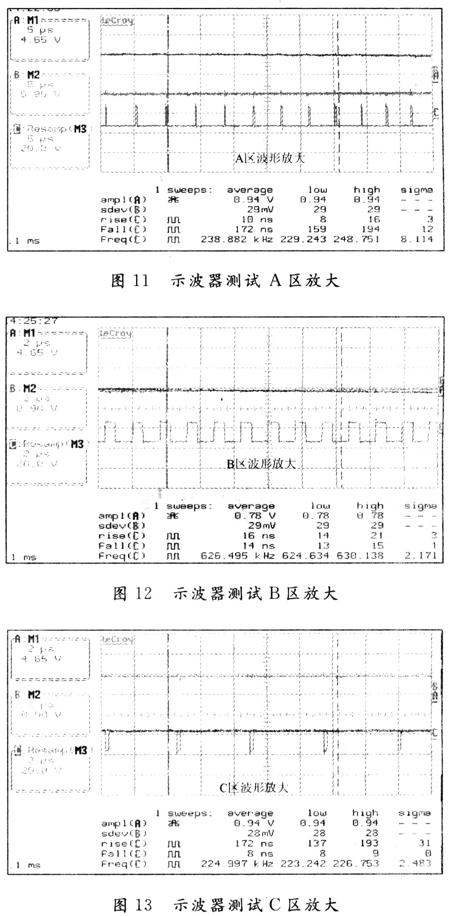 由圖10~圖13可知,輸入波形疊加有高頻雜波。說明前端引入不良干擾,需進一步分析改進;輸出波形平滑,無交越失真,Deadtime特性較好;輸入/輸出正弦波相位相反,直接由電阻RA128等形成閉環(huán)負反饋通路,降低了噪聲干擾,并進行增益控制。A,B,C區(qū)的拓展圖輸出正弦波峰、波谷、S區(qū)域處PWM的頻率分別為238.8 kHz,224.9 kHz,626.4 kHz,占空比不同,符合三角波采樣特性。圖中波峰、波谷處PWM脈沖fall下降沿和rise上升沿更為陡峭,相比S形區(qū)域,包含大量高頻諧波,易引起EMI輻射,但通過巴特沃思二階濾波器濾波后,輸出正弦波良好,無明顯高頻雜波迭加,EMC測試也無明顯對外輻射頻率,滿足了設計需要。