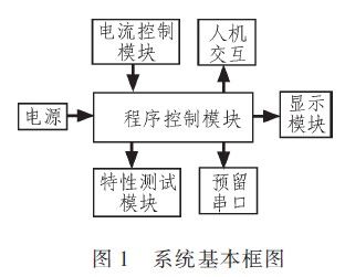 系統(tǒng)主要可以劃分為程序控制模塊、電流控制模塊、特性測試模塊和顯示模塊等4大部分,系統(tǒng)基本框圖如圖1所示。