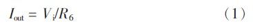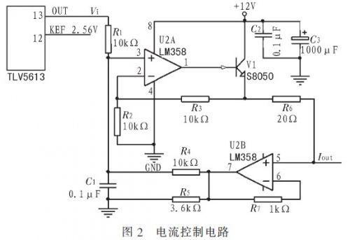 電流控制電路采用數(shù)模轉(zhuǎn)換器芯片TLV5613加上V/I轉(zhuǎn)換電路構(gòu)成穩(wěn)定電流源,可通過單片機(jī)程序控制輸出所需要的電流給測量回路供電以滿足系統(tǒng)測試對電流的要求。在極性測試環(huán)節(jié)可給出合適的電流值,便于系統(tǒng)測量二極管電壓值并據(jù)此判斷二極管的好壞及極性;在特性測試環(huán)節(jié)可根據(jù)設(shè)定電流值增大或減小回路電流,使其與設(shè)定值一致;在伏安特性曲線繪制環(huán)節(jié)可給出由小到大逐漸增大的電流值便于系統(tǒng)采樣繪圖。