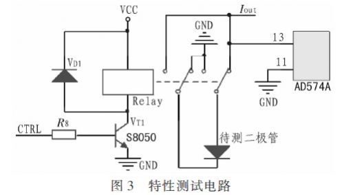 特性測試電路如圖3所示,圖中左側(cè)為繼電器控制電路,當(dāng)CTRL端為高電平時,三極管VT1導(dǎo)通,VCC通過VT1加載到繼電器5引腳,繼電器動作,被測二極管接入極性轉(zhuǎn)換,二極管極性匹配后,即可進(jìn)行特性測試。