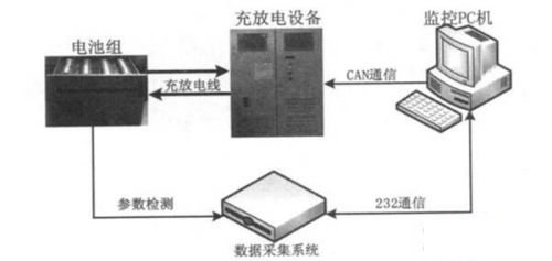 測(cè)試平臺(tái)的結(jié)構(gòu)如圖1所示,以單片機(jī)為核心的電池?cái)?shù)據(jù)采集系統(tǒng)直接對(duì)電池組的單體電壓、總電壓、溫度、電流、充放電容量、充放電能量等信息進(jìn)行精確測(cè)量,并通過(guò)RS232總線將數(shù)據(jù)發(fā)送到上位機(jī)。由微型計(jì)算機(jī)構(gòu)成的上位機(jī)監(jiān)控系統(tǒng), 實(shí)時(shí)顯示并記錄接收到的測(cè)試數(shù)據(jù), 對(duì)數(shù)據(jù)進(jìn)行分析,監(jiān)控測(cè)試系統(tǒng)工作狀態(tài)。另外可根據(jù)具體的實(shí)驗(yàn)要求,控制充放電設(shè)備按照編程指令輸出電流,模擬電池在某些特定條件下的使用情況。充放電設(shè)備實(shí)現(xiàn)電池組的充放電, 完成電池和電網(wǎng)之間能量的雙向流動(dòng), 與監(jiān)控PC 機(jī)通過(guò)CAN 通信, 可接收監(jiān)控PC機(jī)的編程控制指令。文中主要完成數(shù)據(jù)采集系統(tǒng)、上位機(jī)監(jiān)控系統(tǒng)的設(shè)計(jì)并實(shí)現(xiàn)各部分之間的實(shí)時(shí)通訊。