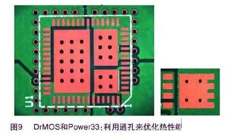 至于版圖布局,金屬較多顯然很有助益。更厚的頂層有助于降低溫度,不過也許對PCB的其余部分并不適合,因為成本增加了,其它元件需要的更精細的間距也不可能實現(xiàn)。更大的銅面積很有用,但又會消耗PCB空間。這些應(yīng)該盡可能由焊料覆蓋,因為金屬表面比涂漆表面的散熱性更好。在多層PCB中,有時利用內(nèi)層來協(xié)助散熱。熱通孔(填充焊料)有時可用來把熱量擴散到PCB的另一面去(圖9)。
