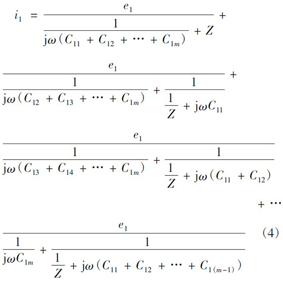 設(shè)一次繞組有3 層,每層m 匝,二次繞組僅一層,為n 匝。當(dāng)變壓器磁芯中的磁通發(fā)生變化,便會(huì)同時(shí)在一次側(cè)和次級(jí)產(chǎn)生感應(yīng)電動(dòng)勢(shì)。根據(jù)疊加定理,可認(rèn)為這是僅一次繞組有感應(yīng)電動(dòng)勢(shì)、二次繞組電動(dòng)勢(shì)為零和僅二次繞組有感應(yīng)電動(dòng)勢(shì)、一次繞組電動(dòng)勢(shì)為零兩種情況的疊加。僅一次繞組有感應(yīng)電動(dòng)勢(shì)、二次繞組電動(dòng)勢(shì)為零的情況如圖5 所示。圖5 中:e1為每匝一次繞組的感應(yīng)電動(dòng)勢(shì);C1x為一匝最外層一次繞組與二次繞組間的寄生電容。