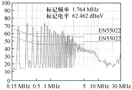 根據(jù)圖3 所示的結(jié)構(gòu)。繞制變壓器,并在交流整流濾波后增設(shè)13 mH 差模濾波電感和6. 8差模濾波電容,對(duì)開關(guān)電源進(jìn)行傳導(dǎo)EMI 測(cè)試,結(jié)果如圖6 所示。由圖6 可見,傳導(dǎo)EMI 非常嚴(yán)重,不能通過電磁干擾測(cè)試。在交流整流前增設(shè)35 mH 共模濾波電感,傳導(dǎo)EMI 測(cè)試結(jié)果如圖7 所示,產(chǎn)品即可通過測(cè)試。比較測(cè)試結(jié)果可得出:在圖3 所示的電路中,主要是由于大量共模傳導(dǎo)EMI,才使電源不能通過電磁干擾測(cè)試。