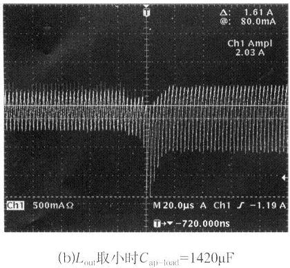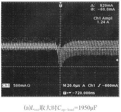 輸出電壓的穩(wěn)定過程中,一方面由輸出濾波電感的儲能來逐步補充,另一方面由反饋環(huán)控制電路原邊快速輸出更大功率。輸出電感的取值一般由電流紋波系數(shù)λ和電源的空載特性來確定,為了避免容性跳變輸出電壓過大的下沖,使控制電路達到極限,電感的取值要大于λ的理論值計算所得數(shù)值,但同時也要考慮輸出失載時的電壓上沖幅度,所以輸出電感也不能太大,大的電感一般不易制作、成本較高,所以電感的實際取值可以用實驗的方法得到。圖4給出了輸出電感Lout不同取值時,容性負載突變時輸出電感電流的跳變波形和最大的容性負載能力。