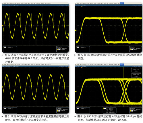 之所以出現(xiàn)抖動(dòng),是因?yàn)锳FG擁有固定的取樣速率,其不是數(shù)據(jù)速率的倍數(shù)。AWG則沒(méi)有這種限制(盡管任何實(shí)際環(huán)境信號(hào)源都會(huì)產(chǎn)生某些抖動(dòng))。