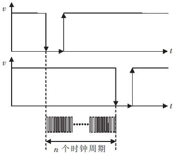 當(dāng)無運動物體遮擋光電開關(guān)時,光電開關(guān)的接收端輸出高電平信號,當(dāng)有物體經(jīng)過遮擋時,光電開關(guān)的接收端輸出低電平信號。即當(dāng)高速物體經(jīng)過一對光電開關(guān)時會先后形成2 個高電平到低電平的脈沖信號。通過計時周期的方式測出這2 個下降沿之間的計數(shù)周期個數(shù)n,計時原理如圖1 所示。