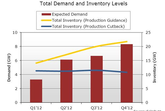 Q1’12-Q4’12全球光伏需求與電池片/組件庫存比較