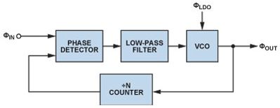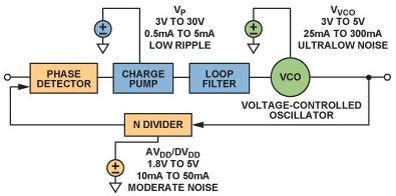 鎖相環(huán)(PLL)是現(xiàn)代通信系統(tǒng)的基本構(gòu)建模塊PLLs通常用在無線電接收機(jī)或發(fā)射機(jī)中,主要提供"本振"(LO)功能;也可用于時鐘信號分配和降噪,而且越來越多地用作高采樣速率模數(shù)或數(shù)模轉(zhuǎn)換的時鐘源。由于每一代PLL的噪聲性能都在改善,因此電源噪聲的影響變得越來越明顯,某些情況下甚至可限制噪聲性能。本文討論圖1所示的基本PLL方案,并考察每個構(gòu)建模塊的電源管理要求。