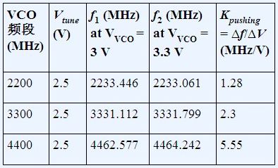 VCO推壓的測量方法如下:向VTUNE引腳施加直流調(diào)諧電壓,改變電源電壓并測量頻率變化。推壓系數(shù)是頻率變化與電壓變化之比,如表1所示,使用的是ADF4350 PLL.