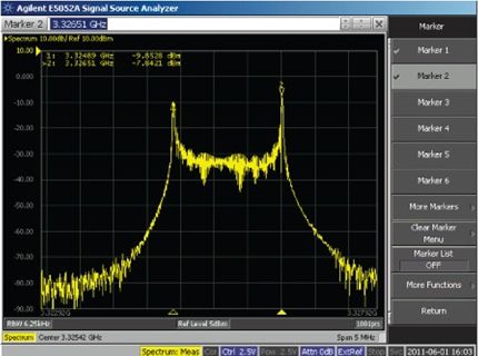 另一種方法:將低頻方波直流耦合至電源內(nèi),同時觀察VCO頻譜任一側(cè)上的頻移鍵控 (FSK)調(diào)制峰值(圖2)。峰值間頻率偏差除以方波幅度,便得出VCO推壓系數(shù)。該測量方法比靜態(tài)直流測試更精確,因?yàn)橄伺c直流輸入電壓變化相關(guān)的任何熱效應(yīng)。圖2顯示ADF4350 VCO輸出在3.3 GHz、對標(biāo)稱3.3 V電源施加10 kHz、0.6 V p-p方波時的頻譜分析儀曲線圖。對于1.62 MHz/0.6 V或2.7 MHz/V的推壓系數(shù),最終偏差為3326.51 MHz – 3324.89 MHz = 1.62 MHz.該結(jié)果可與表1中的靜態(tài)測量 2.3 MHz/V比較。