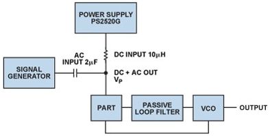 電荷泵的低功耗使其看似頗具吸引力,可使用升壓轉(zhuǎn)換器從較低的電源電壓產(chǎn)生高電荷泵電壓,然而與此類DC-DC轉(zhuǎn)換器相關(guān)的開關(guān)頻率紋波可能在VCO的輸出端產(chǎn)生干擾雜散音。高PLL雜散可能造成發(fā)射機(jī)發(fā)射屏蔽測試失敗,或者降低接收機(jī)系統(tǒng)內(nèi)的靈敏度和帶外阻塞性能。為幫助指導(dǎo)轉(zhuǎn)換器紋波的規(guī)格,使用圖6的測量設(shè)置針對各種PLL環(huán)路帶寬獲得全面電源抑制曲線圖與頻率的關(guān)系。