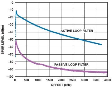 電荷泵將鑒相器誤差電壓轉(zhuǎn)換為電流脈沖,并通過PLL環(huán)路濾波器進(jìn)行積分和平滑處理。電荷泵通??稍谧疃嗟陀谄潆娫措妷海╒P)0.5 V的電壓下工作。例如,如果最大電荷泵電源為5.5 V,那么電荷泵只能在最高5 V輸出電壓下工作。如果VCO需要更高的調(diào)諧電壓,則通常需要有源濾波器。有關(guān)實(shí)際PLL的有用信息和參考設(shè)計(jì),請參見電路筆記CN-0174,5,處理高壓的方式請參見利用高壓VCO設(shè)計(jì)高性能鎖相環(huán),"6該文章發(fā)表于模擬對話第43卷第4期(2009)。有源濾波器的替代方案是使用PLL和針對更高電壓設(shè)計(jì)的電荷泵,例如ADF4150HV ADF4150HV可使用高達(dá)30 V的電荷泵電壓工作,從而在許多情況中省去了有源濾波器。