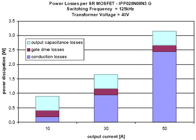 要優(yōu)化SR MOSFET的效率,必須找到開(kāi)關(guān)損耗與導(dǎo)通損耗之間的最佳平衡點(diǎn)。在輕負(fù)載條件下,RDS(on)導(dǎo)通損耗占總功耗的比例極低。在這種情況下,在整個(gè)負(fù)載范圍內(nèi)基本保持不變的開(kāi)關(guān)損耗是主要損耗。但是,當(dāng)輸出電流較高時(shí),導(dǎo)通損耗則成為最主要的損耗,其占總功耗的比例也最高,請(qǐng)參見(jiàn)圖2。