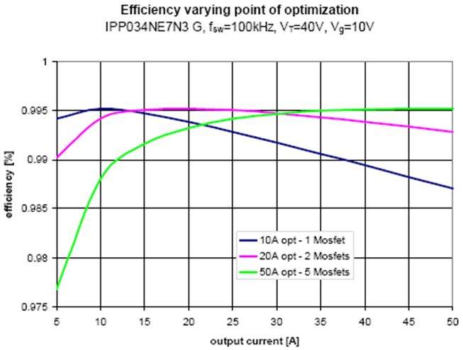 為闡明這個(gè)問(wèn)題,圖4顯示了不同優(yōu)化方法得到的效率。圖中所示效率曲線為,當(dāng)變壓器電壓為40V、柵極驅(qū)動(dòng)電壓為10V、開(kāi)關(guān)頻率為100kHz時(shí)計(jì)算得到的12V同步整流級(jí)的效率。在75V優(yōu)化表中選擇 IPP034NE7N3,按10 A MOSFET電流進(jìn)行設(shè)計(jì),所得到的優(yōu)化方案僅需一個(gè)MOSFET。如圖4所示,這種優(yōu)化方案能夠在低電流時(shí)實(shí)現(xiàn)很高的效率,而在高電流時(shí)效率卻極低。按50 A進(jìn)行優(yōu)化設(shè)計(jì),所得到的最佳方案則需要5個(gè)MOSFET。采用這種優(yōu)化方案,低電流時(shí)的效率將低得不能接受,但在滿負(fù)載時(shí)可以達(dá)到最高效率。因此,對(duì)該設(shè)置而言,最佳優(yōu)化方案是采用兩個(gè)并聯(lián)的MOSFET,從而獲得整體均衡的效率。