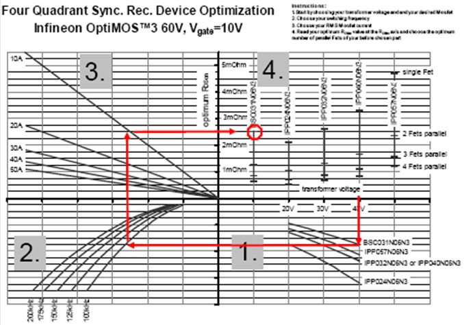 為了幫助開(kāi)發(fā)人員更輕松地為SR應(yīng)用選擇最優(yōu)MOSFET,下面介紹一個(gè)四象限SR器件優(yōu)化表。借助這個(gè)優(yōu)化表,可以根據(jù)三個(gè)應(yīng)用參數(shù)找到最適合的器件:次級(jí)變壓器電壓、開(kāi)關(guān)頻率和RMS MOSFET電流。為便于理解,圖5給出了一個(gè)實(shí)際的例子。