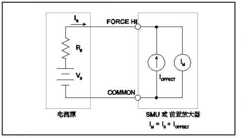 對(duì)于理想的安培計(jì),當(dāng)其輸入端子保持開路時(shí),其讀數(shù)應(yīng)為零。然而,現(xiàn)實(shí)中的安培計(jì)在輸入開路時(shí)確實(shí)存在小電流。這一電流被稱為輸入偏移電流,是由于有源器件的偏置電流以及流過儀器中絕緣體的漏泄電流產(chǎn)生的。SMU內(nèi)產(chǎn)生的偏移電流已包括在吉時(shí)利4200-SCS型的技術(shù)指標(biāo)中。如圖1所示,輸入偏移電流增加至被測電流,所以儀表測量的是兩個(gè)電流之和。