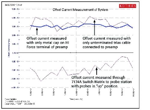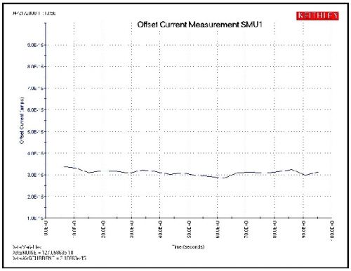 將系統(tǒng)配置為進(jìn)行超低電流測量的前幾步之中有一步是確定整個(gè)測量系統(tǒng)的偏移和漏泄電流,包括4200-SCS本身、連接電纜、開關(guān)矩陣、測試夾具和探針。這可確定整個(gè)系統(tǒng)的噪底限值,并設(shè)置一個(gè)開始點(diǎn),如果可能的話則進(jìn)行改進(jìn)。從測量源測量單元(SMU)的偏移開始,然后繼續(xù)增加測量電路組件,直到連接了除被測裝置(DUT)之外的全部組件。直接由帶有4200-PA遠(yuǎn)程前置放大器的4200-SMU利用KITE軟件進(jìn)行測量。