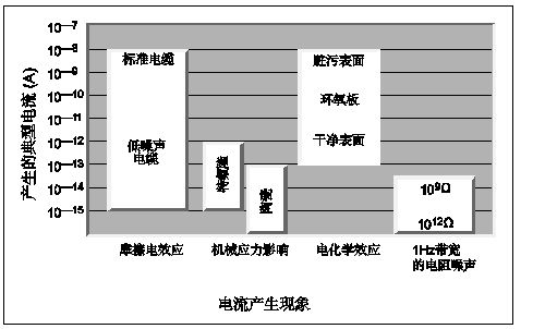 確定了電流偏移、漏流及所有不穩(wěn)定性后,采取措施減小測量誤差將有助于提高測量準(zhǔn)確度。這些誤差源包括建立時(shí)間不足、靜電干擾、漏泄電流、摩擦效應(yīng)、壓電效應(yīng)、污染、濕度、接地環(huán)路,以及源阻抗。圖5中匯總了本節(jié)討論的部分電流的幅值。