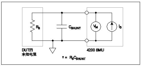 測量電路的建立時(shí)間在測量小電流和高電阻時(shí)尤其重要。建立時(shí)間是指施加或改變電流或電壓后測量達(dá)到穩(wěn)定的時(shí)間。影響測量電路建立時(shí)間的因素包括并聯(lián)電容(CSHUNT)和源電阻(RS)。并聯(lián)電容是由于連接電纜、測試夾具、開關(guān)和探針造成的。DUT的源電阻越高,建立時(shí)間越長。圖6的測量電路中標(biāo)出了并聯(lián)電容和源電阻。