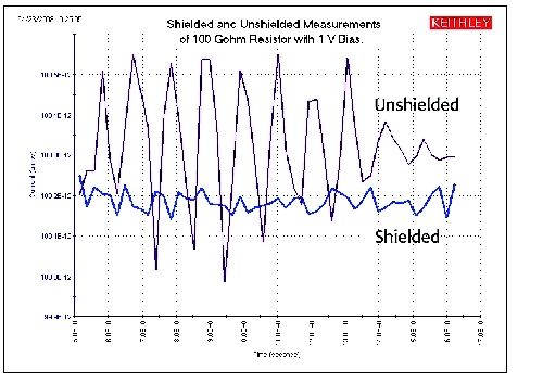 為了減小靜電場影響,被測電路可被密封在一個(gè)靜電屏內(nèi)。圖8所示為非屏蔽和屏蔽測量一個(gè)100GΩ電阻之間的巨大差異。非屏蔽測量比屏蔽測量時(shí)的噪聲要大得多。