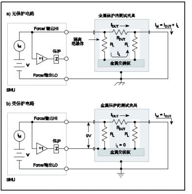 在圖11b中,金屬安裝板被連接至SMU的保護(hù)端子。隔離絕緣體頂部和底部的電壓接近相同電勢(0V壓降),所以在隔離絕緣體中就不會(huì)有漏流影響測量準(zhǔn)確度。由于金屬安裝板將處于保護(hù)電勢,所以為安全起見,金屬屏蔽必須連接至地。