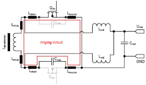 并且,環(huán)路的寄生電阻會抑制振蕩(Coss = MOSFET的輸出電容, Lstray = Lsource + Ldrain + LPCB + Ltransformer)。僅當二次側(cè)的環(huán)路電感限制了電流換向時,此處討論的波形形狀才有效。這就意味著,限制di/dt的不是一次側(cè)MOSFET的開啟速度,而是電源的二次側(cè)的雜散電感。
