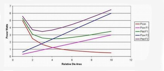 該曲線圖顯示半導(dǎo)體體積本質(zhì)上并未隨頻率而變化,而這一關(guān)系可能過于簡單化。與半導(dǎo)體相關(guān)的損耗主要有兩類:傳導(dǎo)損耗和開關(guān)損耗。同步降壓轉(zhuǎn)換器中的傳導(dǎo)損耗與 MOSFET 的裸片面積成反比關(guān)系。MOSFET 面積越大,其電阻和傳導(dǎo)損耗就越低。