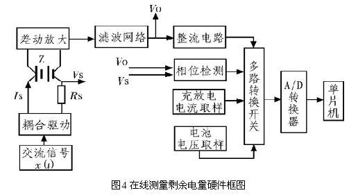 給電池施加一個(gè)固定頻率和固定電流(日前一般使用l kHz頻率、50 mA小電沆),然后對(duì)其電壓進(jìn)行采樣,經(jīng)過(guò)整流、濾波等一系列處理后通過(guò)運(yùn)放電路計(jì)算出該電池的內(nèi)阻值。圖4為在線(xiàn)測(cè)量剩余電量硬件框圖。