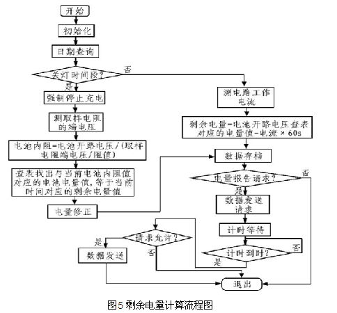 通過(guò)計(jì)算電流在時(shí)域上的積分,可得出電量變化值,在路燈工作前檢測(cè)到的電池電量作為初始電量,則剩余電量為初始電量減去電量變化值。同時(shí)通過(guò)對(duì)MPPT電路的輸出電流做積分,作為電量變化的校正值,從而得到較準(zhǔn)確的剩余電量值。圖5為剩余電量計(jì)算流程圖。