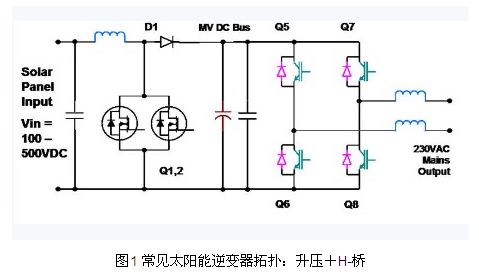 升壓+H-橋拓?fù)涫翘?yáng)能逆變器極為常用的拓?fù)渲?,是一種兩級(jí)非隔離拓?fù)?。其第一?jí)是升壓級(jí),用于把模塊的可變輸出電壓(例如100V – 500V)升高到更大的中間電壓,后者必須大于實(shí)際峰值主線(xiàn)電壓(如230V x sqrt(2),或>325V)。該升壓級(jí)還有一個(gè)重要作用,就是為了實(shí)現(xiàn)效率最大化,太陽(yáng)能模塊必須運(yùn)作產(chǎn)生盡可能大的功率,而太陽(yáng)能模塊的功率 曲線(xiàn)可通過(guò)輸出電流乘以輸出電壓數(shù)值獲得。功率特性中有一個(gè)最大點(diǎn),被稱(chēng)為“最大功率點(diǎn)”或MPP,而這精確位置會(huì)隨著模塊的類(lèi)型、溫度和日照陰影等因素而變化。