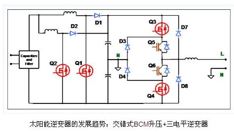 有很多方法能夠提高升壓逆變器的效率。由于升壓逆變器可在連續(xù)傳導(dǎo)模式或邊界傳導(dǎo)模式(CCM 或 BCM)下工作,這就衍生出不同的優(yōu)化方案。在CCM模式中,損耗的一大主因是升壓二極管的反向恢復(fù)電流;在這種情況下,一般使用碳化硅二極管或飛兆半導(dǎo)體的Stealth 二極管來(lái)解決。太陽(yáng)能逆變器更常采用的是BCM模式,而盡管對(duì)這類(lèi)功率級(jí)通常建議選擇CCM模式,但采用BCM模式的原因在于BCM模式中二極管的正向電 壓要低得多。而且,BCM模式也具有高得多的EMI濾波器和升壓電感紋波電流。這時(shí),良好的高頻電感設(shè)計(jì)是一解決方案。