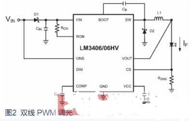雙線PWM調(diào)光是用于汽車內(nèi)部照明的常見(jiàn)方法。當(dāng)VIN被調(diào)制為低于 VIN-NOMINAL的 70% 時(shí),VINS引腳(圖2)檢測(cè)電壓的變化,并將PWM波形轉(zhuǎn)換為和輸出驅(qū)動(dòng)電路相應(yīng)的PWM。這種方法的缺點(diǎn)是轉(zhuǎn)換器的電源必須包含一個(gè)電路,以便為其直流輸出提供 PWM 波形。
