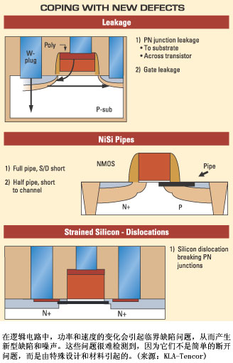 涉足尖端技術(shù)研究工作的芯片制造商正在把無數(shù)新材料和奇特的器件結(jié)構(gòu)結(jié)合起來,用于65nm及更低節(jié)點的量產(chǎn)。同時他們發(fā)現(xiàn),在這些研究上的努力生產(chǎn)的結(jié)果還包括目前必須著手解決各器件各個層上出現(xiàn)的越來越多的細微的電缺陷和微小物理缺陷。在存儲器中,可能會出現(xiàn)多晶硅阻塞管道問題poly-plug piping problems,從而引起B(yǎng)PSG(硼磷硅酸鹽玻璃)孔隙問題。在邏輯領(lǐng)域,使用應(yīng)變硅引起的應(yīng)變硅位錯可能產(chǎn)生缺陷,有時這類缺陷直到后道工藝才顯露出來。