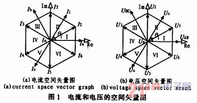 矩陣變換器應用雙空間矢量調(diào)制法(SVM)時可以等效為一個虛擬的整流器和一個虛擬的逆變器,它們的6個有效的空間矢量分別如圖1所示,對輸入電流和輸出電壓分別進行嵌套。從而有36種可能的扇區(qū)組合。
