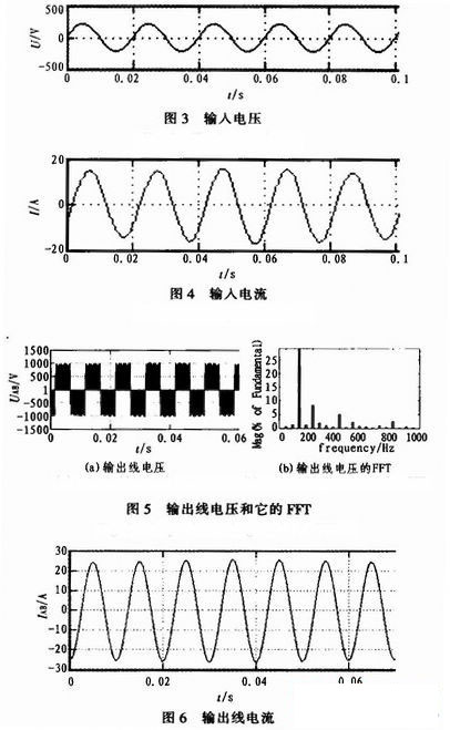 設定的輸出頻率為100 Hz,電壓調(diào)制比為0.75,仿真算法為ode15s,仿真時間為0.4s,濾波參數(shù)為L=100mH,C=70μF,負載為星形連接感性RL負載,采用輸入功率因素為1的控制策略,輸入相電壓和相電流基本同相位,仿真結(jié)果表明矩陣變換器的輸出電壓是一個正弦性很好的PWM波形,諧波分量比較小,輸出線電流的正弦性較好,驗證了控制策略的正確性,以下為各仿真波形。