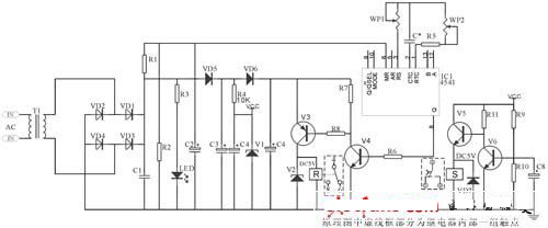 該電路核心部分由IC4541構(gòu)成,延時(shí)設(shè)定由RP2、C*設(shè)定,A-B端根據(jù)需求接相應(yīng)高、低電平(設(shè)定端)內(nèi)部2繞組閉鎖繼電器采用DC12V(因繼電器工作電壓與IC4060組成延時(shí)電器要低,則為保證其驅(qū)動(dòng)則分別由V6、V7、V1、V3構(gòu)成)。其中C2為二次儲能器件,可根據(jù)延時(shí)的長短予以調(diào)整,C4為完成S置位線圈工作。