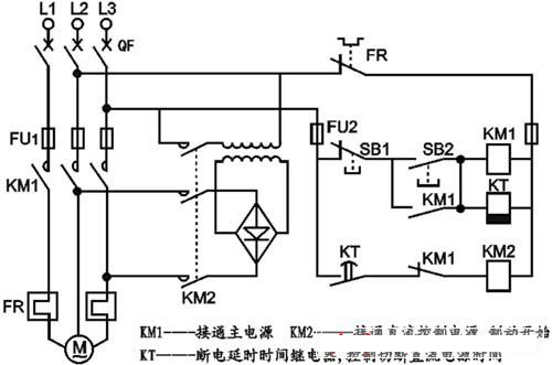 制動(dòng)過程:按下停止按鈕SB1→KM1斷電,KM1主觸點(diǎn)斷開,電機(jī)脫離電源,KM1輔助常閉觸點(diǎn)恢復(fù)閉合,KM2通電,接入直流電源,制動(dòng)開始,同時(shí)KM1輔助常開觸點(diǎn)又恢復(fù)斷開,則KT線圈呈斷電狀態(tài),延時(shí)開始,待所設(shè)延時(shí)時(shí)間到達(dá)后,KT的延時(shí)斷開常開觸點(diǎn)恢復(fù)斷開,KM2失電,切斷直流電源,制動(dòng)結(jié)束。