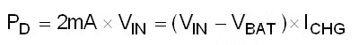 假設(shè)使用5.5V電源供應(yīng)器對單顆1200mAh鋰離子電池進行充電,在0.7°C快速充電電流時,且電池電壓為3V的條件下,可以預(yù)估IC運作的最大耗電量為,1.762W的耗電最大值,此一功耗會使得熱阻抗60°C /W的3×3毫米QFN封裝溫度溫升127°C,即便環(huán)境溫度0°C時,也已經(jīng)超過所允許的125°C硅晶片操作溫度最大值。若設(shè)定充電電流為0.6A(0.5C),則可降低IC溫升為90度,可以操作于35度的環(huán)境溫度中,因此是較佳的設(shè)定電流。