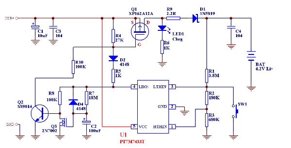 PT7M7433T是上海百利通公司最新設(shè)計的極高精度的一系列電壓檢測器的其中一款,其檢測精度在0-Vcc (5.5V)范圍內(nèi)小于1mV,而且其批量IC的檢測值偏差<±2.5%,這樣完全保證了批量產(chǎn)品的性能一致性和極高的總體性能,我們利用其配合少量外部電路即可組成相當(dāng)簡單的鋰電池充電線路。