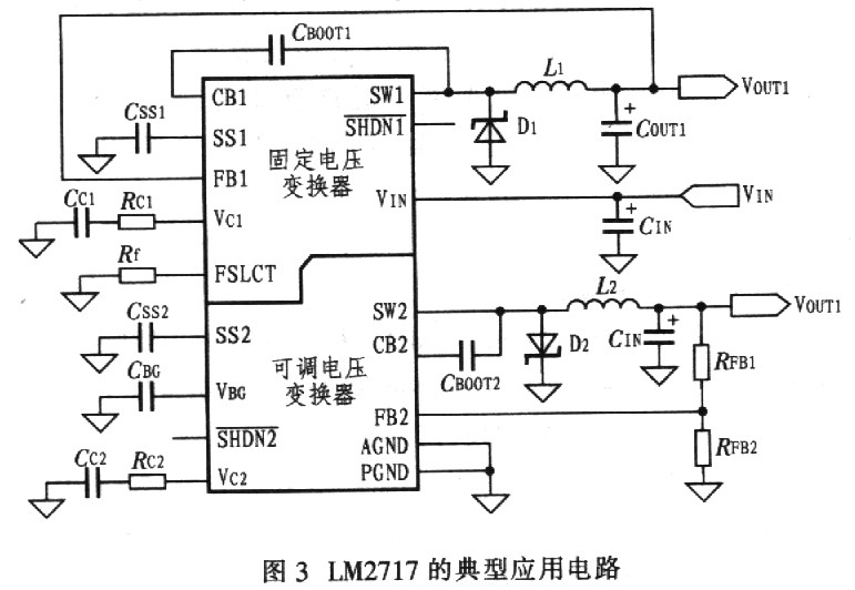 圖3所示是LM2717的典型應(yīng)用電路。圖中,VIN是整個應(yīng)用電路的電壓輸入端,VOUT1是固定降壓變換器的電壓輸出端,VOUT2是可調(diào)降壓變換器的電壓輸出端。CIN、Coot、CSS、CBOOT、L分別是輸入電容器、輸出電容器、軟啟動電容器、自舉電容器、電感,這幾個元件在設(shè)計時應(yīng)著重考慮。這里主要介紹利用該電路進(jìn)行設(shè)計時一些主要外元件的選擇原則及需注意的問題。