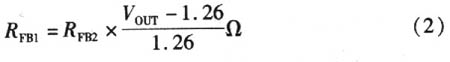 輸出電壓是依據(jù)反饋引腳和連接到輸出端的電阻分壓器設(shè)計的,如圖3所示。反饋引腳的電壓是1.26 V,因此根據(jù)式(2),由反饋電阻比來設(shè)計輸出電壓: