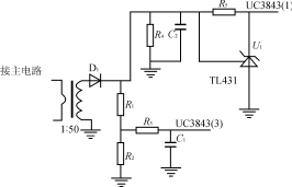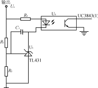 電壓反饋電路如圖3所示,輸出電壓通過(guò)集成穩(wěn)壓器TL431和光耦反饋到UC3843(1)腳,調(diào)節(jié)R1、R2分壓比可設(shè)定和調(diào)節(jié)輸出電壓,達(dá)到較高的穩(wěn)壓精度。如果輸出電壓Uo升高,集成穩(wěn)壓器TL431陰極到陽(yáng)極的電流增大,使光耦輸出三極管電流增大即UC3843(1)腳對(duì)地的分流變大,UC3843輸出脈寬相應(yīng)變窄,輸出電壓Uo減小。同樣地,如果輸出電壓Uo減小,可通過(guò)反饋調(diào)節(jié)使之升高。